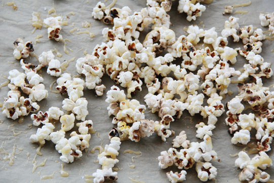 Irgendwann geht es richtig heiß her, ihr hört es – oder seht es, wenn euer Topf einen gläsernen Deckel hat. Sind alle Körner zu schönen Blumenkohlrosen ausgewachsen (eventuell mal am Topf rütteln), auf einem Backpapierbackblech ausbreiten. Mögliche Blindgänger und ähm ... verbrannte Körner aussortieren. Mit löffelweichen Salzkaramellbahnen überziehen.